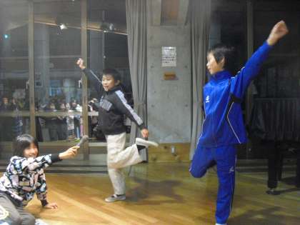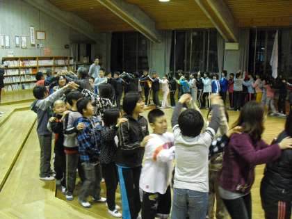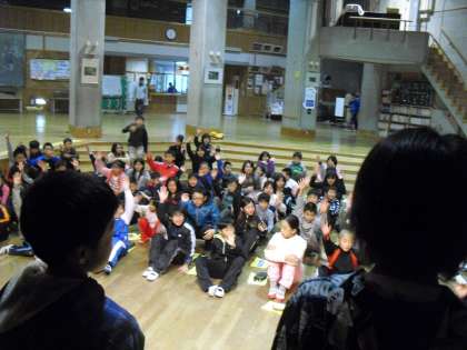 夜になっても雨は降りやまず、ナイトハイクもできませんでした。ホールで楽しくレクレーションです!!