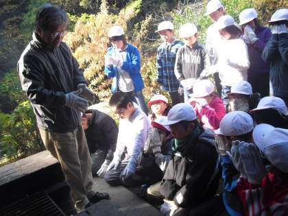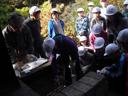 かまどの係りの人たちには、校長先生から「正しい火の起こしかた」についてのレクチャーがありました。煙に耐えながらも一生懸命聞いています。