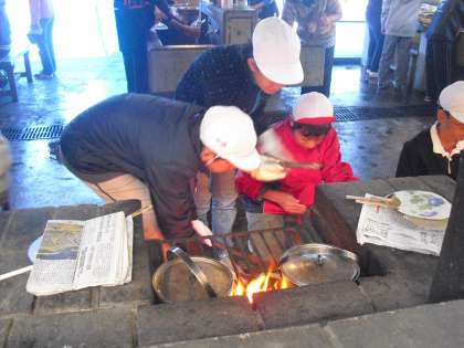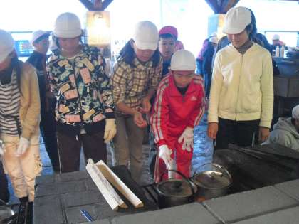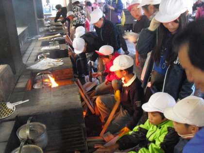 かまどの係りの人たちは、校長先生の教えを守り、順調に火をおこしています。