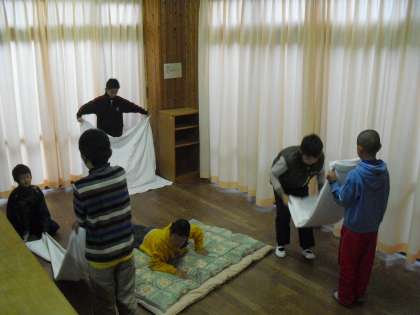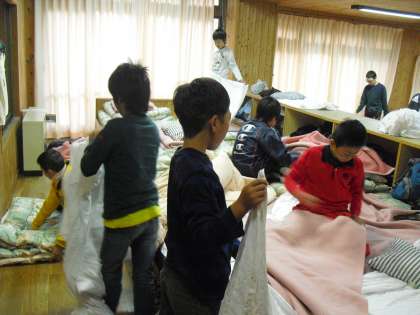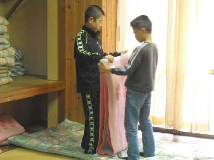 昨晩は9時30分の消灯時刻前に就寝した班も多くあったみたいで、今朝はすっきりとしたお目覚めです。「のどがちょっと痛い人」1名、「少しからだがだるい人」数名を除いて、みんなたいへん元気です!!寝具の片付けも手際よくできるようになってきました。