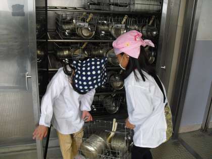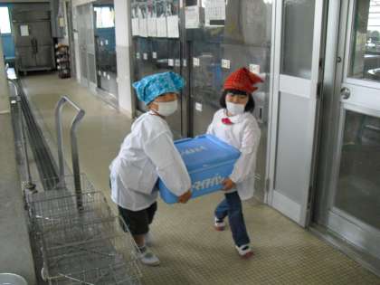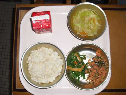 今日の献立は、さけとだいこん葉のまぜごはん、三度豆の煮つけ、キャベツの吉野汁、牛乳でした。