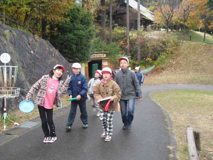 朝食後は、荷物をまとめて、フライングディスクゴルフです。フリスビーをもらって、さあ、出発!!