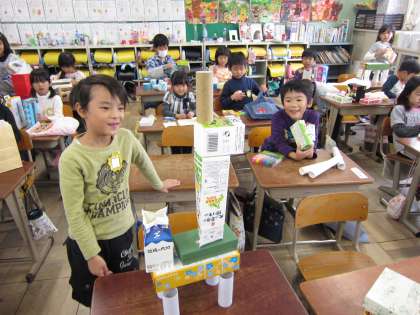 大小さまざまな形の箱を組み合わせて、動物やロボットなどを作りました。
