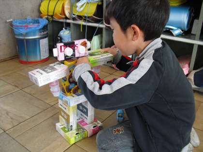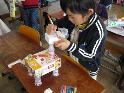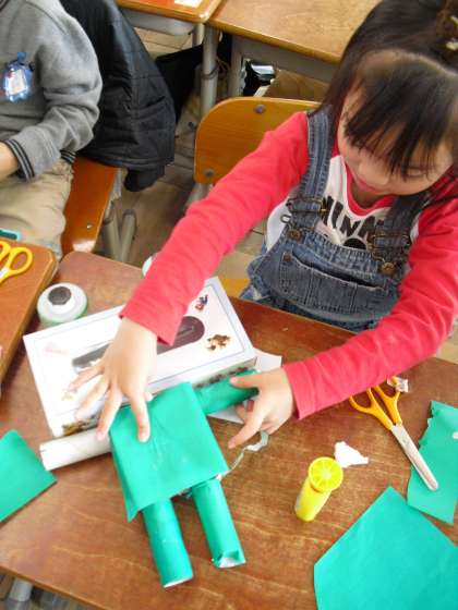 初めて使ったボンドが、なかなかくっつかなくて、苦労していましたが、思い通りの作品ができあがると、うれしそうに眺めていました。