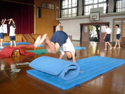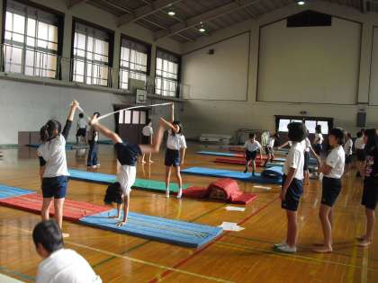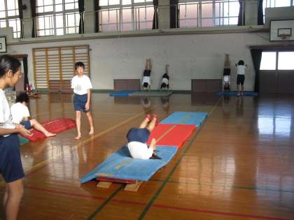 6年生はマット運動の学習で、少しがんばればできそうな技に挑戦中です。工夫した場を活用しながら、うまくできるといいね!!
