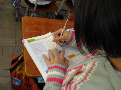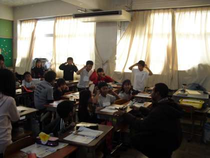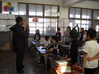 今日はALTのイシャーク・アーメッド先生による外国語活動の学習がありました。アルファベットを聞きとったり、「船長さんの命令」を英語バージョンで「エイリアンの命令」としてゲームをしたりして、英語を楽しみました。