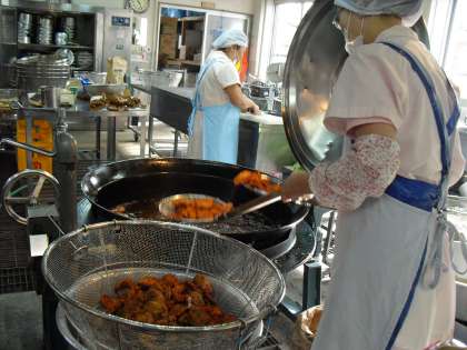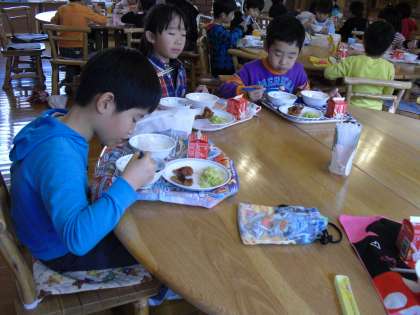 給食感謝の行事献立,一枚一枚手作りのやわらかヒレカツ,細かい塊まで競い合って食べました。ランチルーム給食は1年2組。今日もピカイチの笑顔でおいしくいただきました。