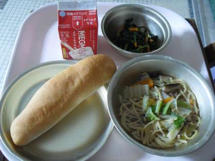 今日の給食は,小型コッペパン・牛乳・五目ラーメン・小松菜のごま油いためでした。
