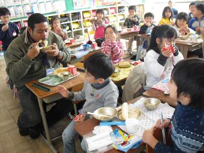 1年1組の教室ではALTのアーメッド先生をゲストにいっしょに給食をあじわいました。