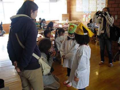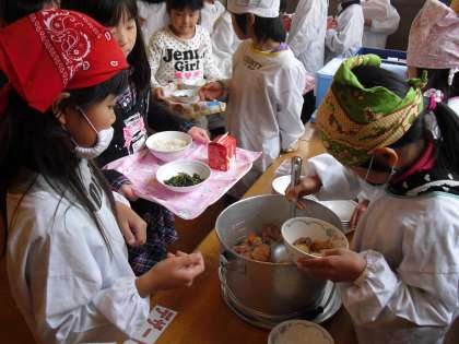 ランチルーム給食は1年2組。PTAの方から新しいエプロンの取材を受けて少し照れくさそうに答えていました。