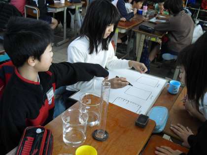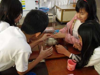 身の回りにあるものを自由に使って、「ならす」には、どうすればよいのかを考えていきました。ポットあり、急須あり、やかんにビーカー、スポイトありの活動で、みんな一生懸命考えていました。「平均」の考え方、もうわかりましたよね!!テストでは、やかんやポットの貸し出しはしませんので、気をつけてね!!