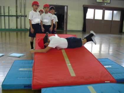 1年生のマットあそびは、いろいろな場でいろいろな回り方をして楽しみます。