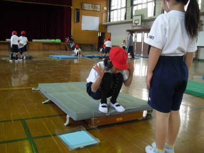 長椅子を2段重ねた場では、落ちないように気をつけて回ることを、長椅子で作った坂の場では、勢いよく続けて回ることを、踏切板を使った場では、少し勢いをつけて回ることをなど、場によっていろいろなことに気をつけたり、回りやすくしたりして活動できるようにしています。たくさん回って、いろいろな動きを身につけられるといいね!