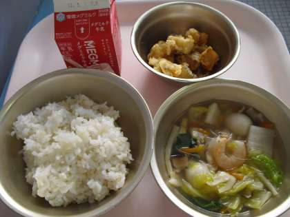 今日の給食は,麦ごはん・牛乳・たらのからあげ・タイピーエンでした。