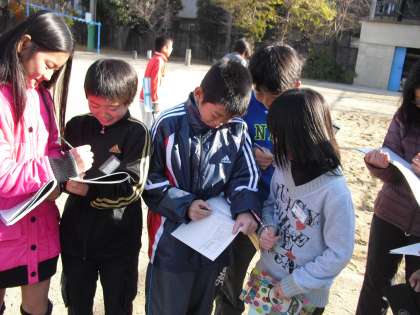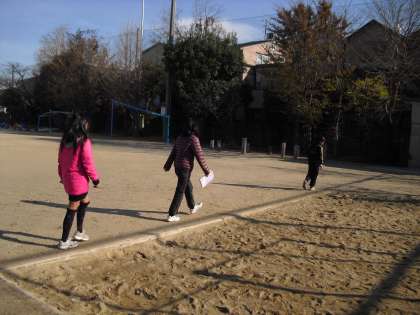 今日の算数は、平均を使って自分の歩幅を知り、その歩幅を使っていろいろな距離を測りました。1歩1歩に集中しながら、みんな一生懸命距離を測っていました。巻尺がない時は、今度からこれで測れますね!