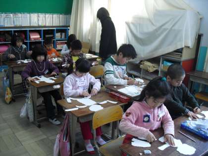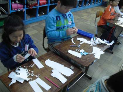 今日の図工は、紙版画です。頭や体、腕や手など 体を部分ごとに手でちぎって、作っていきます。