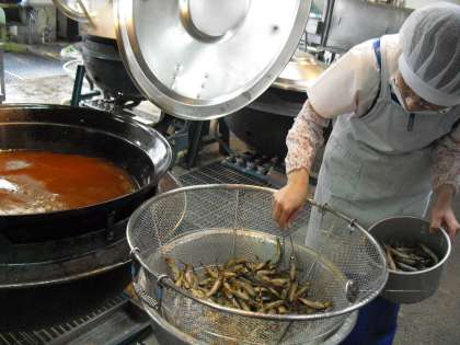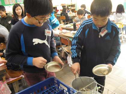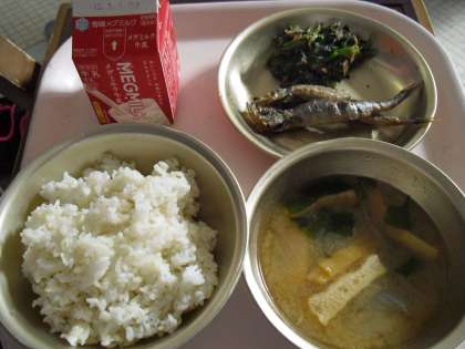 今日の給食は,ごはん・牛乳・ししゃものからあげ・小松菜のごま炒め・みそ汁でした。香ばしく揚げられたししゃもは,一人二匹ずつ配缶され,教室で食器に盛り付けられました。予備のししゃもがクラスに届けられた4年3組,待ってましたとばかりに長蛇の列ができていました。