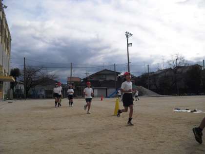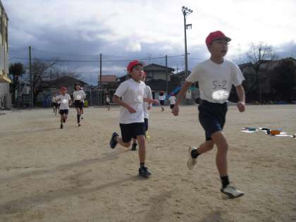5年の体育は、ジョギングです。今日も自分の脈を測りながら、どのようなペースで走ればよいのかを考えながら学習を進めています。
