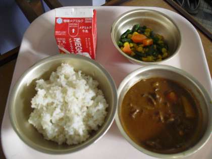 今日の給食は,麦ごはん・牛乳・カレー・野菜のソティでした。