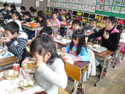 給食調理員さんと給食交流した1年1組。話したいこと,聞きたいこと・・・たくさん交流できたかな。