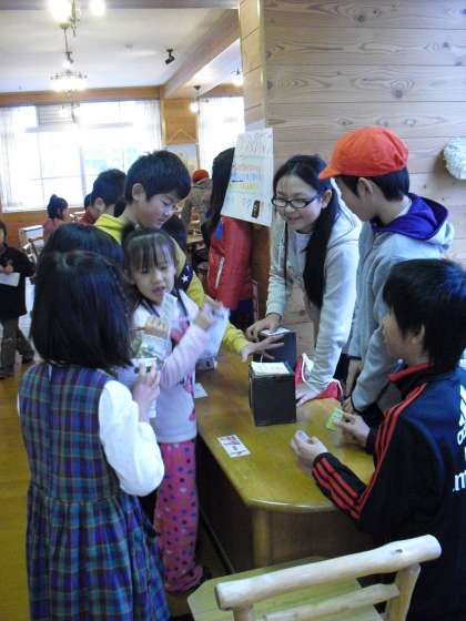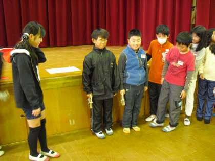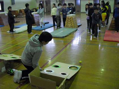 体育館では、棒落とし・的入れ・計測コーナーがあります。がんばって!!