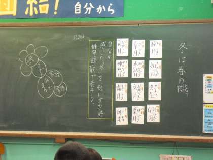 今日は感じた「冬」を詩や俳句、短歌で表すために冬から連想できる言葉をたくさん考えました。どんな作品ができるかな?