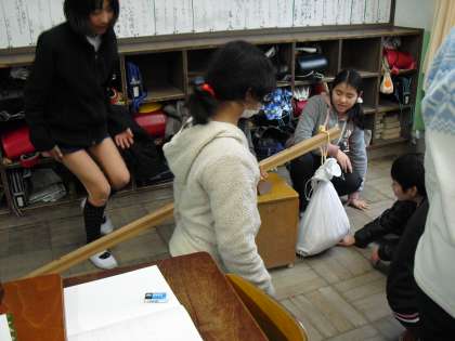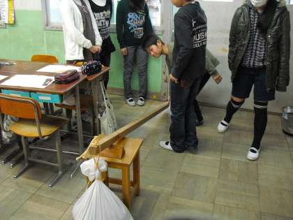 今日の理科では、重い物を楽に持ち上げるには、どうすればよいかを考えました。道具を使って子どもたちが考えている様子をどうぞ。