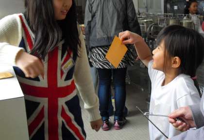 給食調理員さんと給食交流をした1年3組。「給食はなぜ、こんなにおいしいんですか・・・?」「今日の豆はなんという名前の豆ですか・・・?」など,調理員さんにいろいろな質問をしていました。