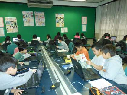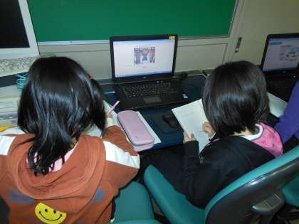 昨日、社会の時間にコンピュータを使って昔の道具を調べました。衣・食・住・遊び、とテーマを決めて調べていきました。調べたいことが見つかった子どもたちは、みんなとっても嬉しそうです。調べたられたことを一生懸命ノートにまとめていきました。