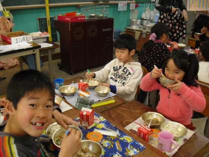学校給食三大いもの一つ「さといも」は(残り二つは,さつまいも・じゃがいもでしょうね。)日本の家庭料理で,単独で煮込んでも、豚肉やタケノコ、しいたけ、ニンジン、もやし、だいこん葉などいっしょに煮込んでもおいしくいただける食材です。今日の給食も具だくさんの栄養満点、ボリュームのあるメニューでした。給食時間,体の芯から温まるメニューで体も心もホッカホカです。
