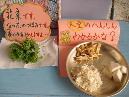 まずは、おだし。京料理はおだしの文化といわれるほど,いろいろな食材からの旨味でまろやかな味つけがされます。今日の給食は,3つのおだしを使っての献立でした。おからは,使用する材料が植物性の物ばかりなので,コクと深みが出るようにといりこだし,花菜のすまし汁は花菜の香りが引きたつよう,昆布と削り節の混合だし。共に,給食室でゆっくりとじかんをかけて旨味を引き出し素材の引き立て役として使いました。