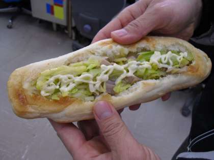 今日の給食は,コッペパン・牛乳・ハムサンドの具・チャウダーでした。