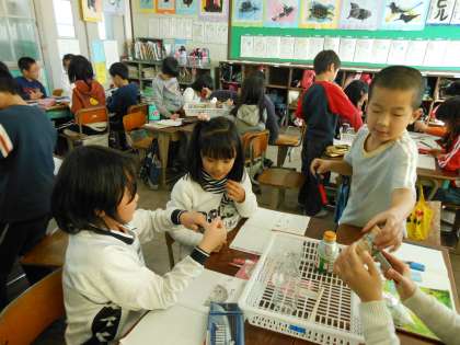 今日の理科は、身近にある物の中で、磁石につく物とつかない物を調べました。予想では、金属でできているものには、すべて磁石にくっつくと思っていた子どもたち。アルミにはくっつかないことを知って、びっくりしていました。磁石にひきつけられるのは、鉄だったんですね。しっかり覚えておきましょうね。