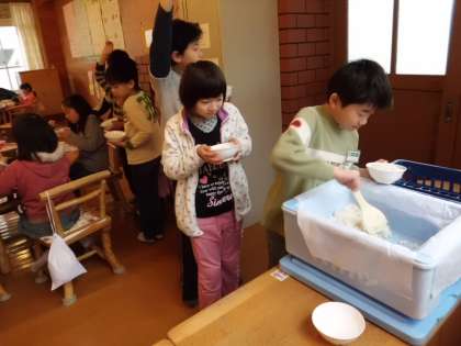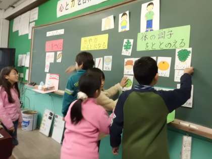 今日の給食は,セルフおにぎり(梅さけ)・牛乳・大根葉のごま炒め・みそ汁でした。食の学習・ランチルーム給食は3年3組。「バランスよく食べよう」では,栄養の三色分類について学習しました。学習時間も給食時間も元気いっぱい食欲旺盛,笑顔があふれていました。