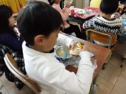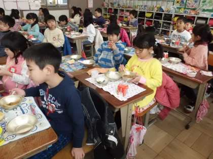 今日の給食は,ごはん・牛乳・トッポギ・ほうれん草ともやしのいためナムル・はっさくでした。トッポギは韓国・朝鮮で食べられている家庭料理です。トッポギ(食品名も料理名もトッポギといいます)は,米粉で作らているのでモチモチとした食感と歯ごたえが特徴です。ごはんがすすむ味つけで子どもたちに好評の新献立でした。デザートははっさくでした。指先に力を入れて分厚い皮をむき始めると教室中にみかんのいい香りが広がり,外は雪がちらつく寒い一日でしたが,一足早く春を感じさせてくれました。