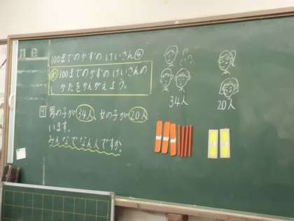1年3組の算数の授業です。今日は100までの数のたし算を勉強しました。答えを求めるだけでなく、どのように計算をすればよいのかも考えました。みんな元気よく自分の考えを発表することができたね。