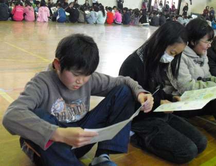 たてわりグループでいっしょに1年間なかよく活動した下級生から、感謝の気持ちがいっぱい書きこまれたプレゼントをもらいました。みんなとってもうれしそうですよね。