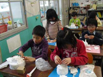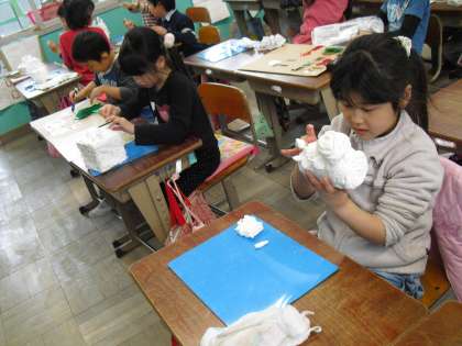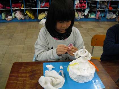 今日の図工は「ケーキやさん」です。身近な容器や材料を活用して紙粘土の使い方を工夫しながら,食べたくなるようなおいしいケーキをつくりました。どのケーキもとってもおいしそうです。