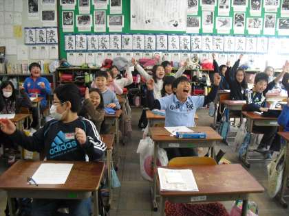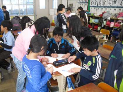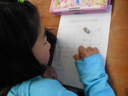 今日の道徳の主題は「明るく楽しい学校生活」です。みんなで「学校自慢ビンゴ」をやりました。やり方は簡単。数字のかわりに、たくさんある川岡小学校の自慢を書きこんでいきます。「みんななかよし」、「あいさつができる」、「5分前行動ができる」、「高学年がやさしい」、「そうじをがんばる」、「読書をよくする」、「先生がわかりやすく教えてくれる」、「先生がイケメン」などなど。みんな、なかなかよく見てますね。