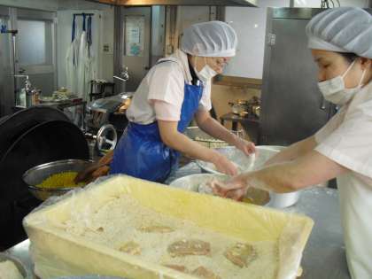 今日の給食は,ごはん・牛乳・トンカツ・ソティ・みそ汁でした。今日は,6年生の卒業祝いの行事献立で,給食室は朝から大忙しでした。豚ロース肉に塩・こしょうで下味をつけ,小麦粉,卵,パン粉の順で衣をつけ一枚一枚油で揚げています。給食のトンカツはソースまで手作りで,トマトケチャップ・トマトピューレ・さとう・ウスターソース・洋からしを煮詰めて作っています。お皿についたソースまでがおいしい理由がここにあるのです。