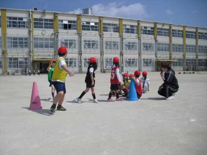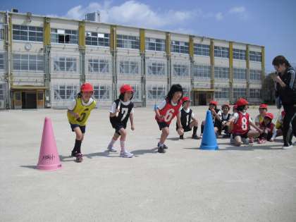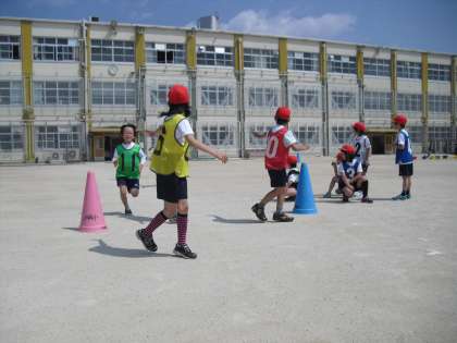 3年生の体育は、リレーです。2年生の時には、折り返しリレーをしたので、トラックを使ってのリレーは初めてです。バトンゾーンも今までとは違って、相手チームの人たちと重なってしまうことがあります。集中しながら、上手にバトンをつなげるといいですね。