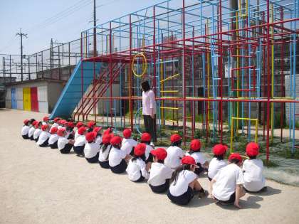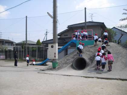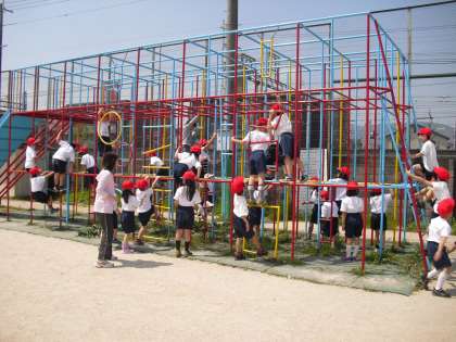 総合遊具では、「親指を回して握り、両手を同時にはなさない」、「総合遊具の2階までしかのぼらない」など、総合遊具の正しい使い方や安全に遊ぶことを先生からしっかりと聞き,遊具あそびを楽しみました。