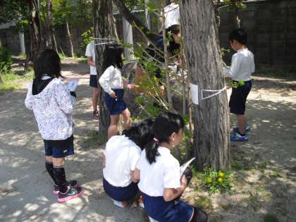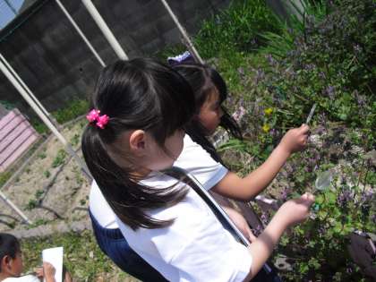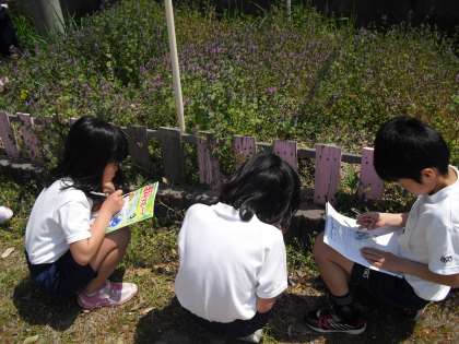 理科「しぜんのかんさつをしよう」では,虫眼鏡を持って運動場に出て,春の植物などを観察しに行きました。みんな真剣な表情で丁寧に観察をしていました。