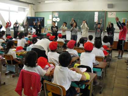 優しく一生懸命に教えてくれる6年生を見て,1年生も頑張って振り付けを覚えていました。しっかり覚えて,大きな声で歌って踊れるようになろうね!