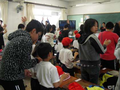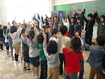 昨日今日と中間休みに6年生のお姉さんお兄さんに教室まで来てもらい,全校合唱の「笑顔がかさなれば」の歌と振り付けを教えてもらいました。