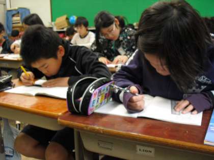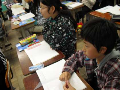 今日の算数は、点対称な図形の性質を用いて、点対称な図形を作図しました。対応する2つの点を結ぶ直線は、対称の中心を通り、対称の中心から対応する2つの点までの長さは等しいんですよね。コンパスや定規を使いながら、みんな一生懸命作図に取り組んでいました。