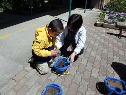 たんぽぽ学級のみんなも種をまきました。うまく蒔けたかな?