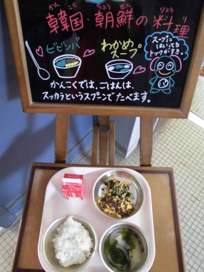今日はセルフ献立の「ビビンバ」でした。お皿に配られた,肉と卵のそぼろと,四種類の野菜を使ったナムルをごはんに混ぜて食べます。ナムルはコチジャンとすりごま,ごま油で味つけされていて,野菜の苦手な子どもたちもおいしく食べていました。マシソヨ!