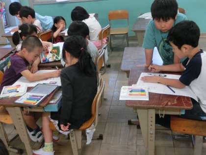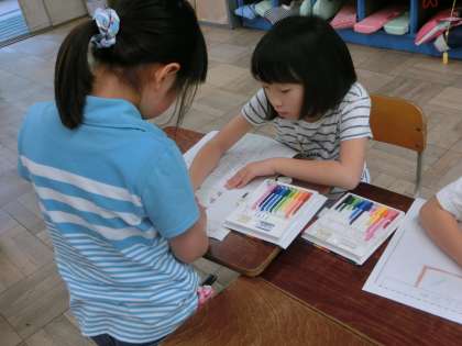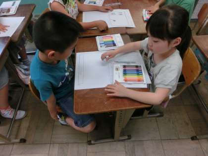 今日は学校探検でつかう部屋ごとのポスターをつくりました。インタビューをもとに記事を書き、絵を描いて仕上げていきます。