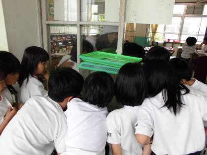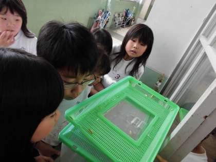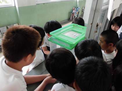 今年も山田名人の季節がやってきました。今年初めてのモンシロチョウの誕生です。朝はまださなぎのままだったのに、みんな大喜びです。これから、どんどんモンシロチョウが育つといいね!